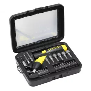 Set 22 piese surubelnita cu clichet 1/4″ 0-63-022 Stanley. Surubelnita cu clichet cu control la rotire. Cutie ergonomica de plastic. set șurubelniță-pistol (vârf plat. 6 mm; Ph2 pt.; vârf plat. 5, 6, 7mm; Ph 1, 2, 3 pct.; Torx: T10, T15, T20; tivuri: 3, 4,...